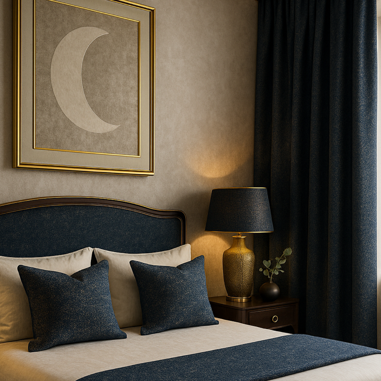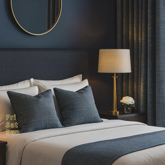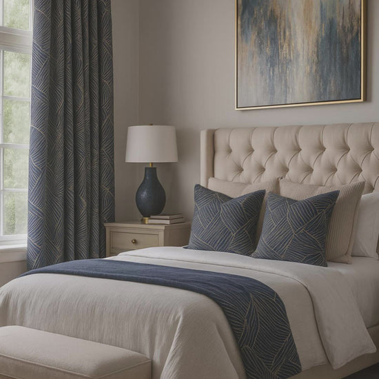 Elevate your space with the Aurum & Azure collection. Our high-density jacquard delivers rich texture, a subtle lustre, and a beautifully structured fall—perfect for living rooms, bedrooms, and formal zones.